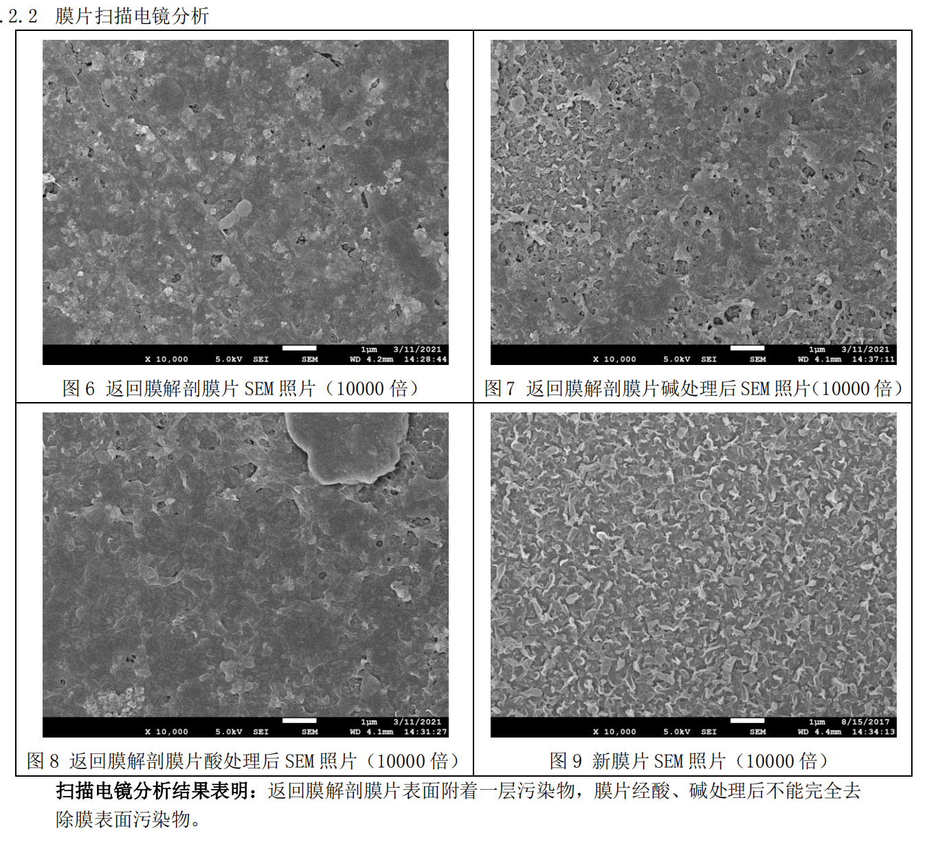 4.1進(jìn)行離線清洗(堿洗、酸洗,并使用多種螯合配方),膜通量有一定恢復(fù)但難以有效恢復(fù)。污堵嚴(yán)重膜元件進(jìn)行返廠處理,下附返廠膜元件廠家膜片掃描電鏡照片及返廠膜元件清洗情況及結(jié)論: