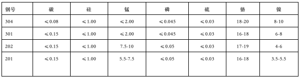不銹鋼在冶煉過程當(dāng)中,由于加入合金元素品種不同,不同品種加入量的不同。其特性也是不同的,為了加以區(qū)別則冠上了不同的鋼號,下面是常見裝飾用不銹鋼不同鋼號“合金元素”含量表僅供參考: