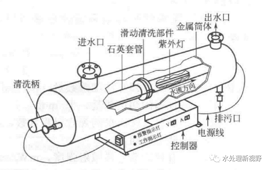 屬承壓型,用金屬簡體和帶石英套管的紫外線燈把被消毒的水封閉起來,結(jié)構(gòu)形式如下圖所示: